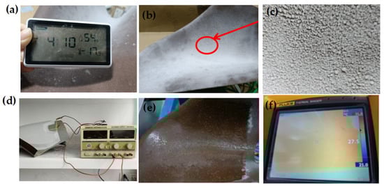 De-icing effect test. (a) Environmental conditions; (b) ice formation diagram of the specimens; (c) close-up diagram of ice formation; (d) de-icing power supply; (e) de-icing effect at 20 s; and (f) surface temperature acquisition. In (b), the red circle shows a partial icing image, and (c) is an enlarged view of the iced part.