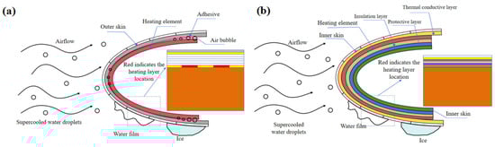 Traditional electrothermal anti-icing and de-icing systems typically exhibit a discrete configuration in which the heating elements are separate from the structural skin, necessitating post-installation attachment using adhesive, as shown in Figure 1a. In contrast, the functionally integrated prototype examined in this study employs an innovative electrothermal–load-bearing co-design approach. This involves an embedded hot-pressing technique that simultaneously couples and co-cures the heating element with the structural component, as depicted in Figure 1b. The functionally integrated electrothermal heating assembly comprises an aluminum alloy metal layer encapsulated within a glass fiber reinforced polymer (GFRP) matrix. This assembly functions as an anti-icing component for the leading edges of aircraft wings and empennages. During typical flight conditions, it is designed to withstand thermal cycling stress loads ranging from −55 to 80 °C.