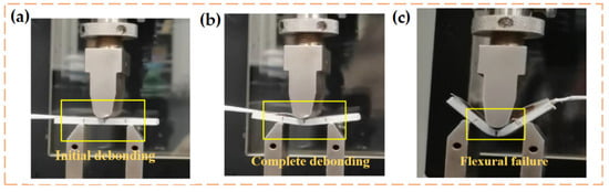 Short beam shear test process. (a) Onset of debonding; (b) full debonding; and (c) bending failure.