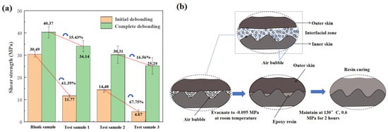 The integrated functional–structural anti-icing/de-icing prototype utilizes an embedded hot-press co-curing process to ensure both the optimal aerodynamic profile and structural integrity of the skin. Under typical flight conditions (−15 °C), the component is required to achieve heating cycle stability exceeding 10,000 cycles, an interlaminar shear strength (ILSS) of at least 35 MPa, and a heating power density of no less than 2.5 W/cm2. Precise control of autoclave parameters, including the heating rate and vacuum pressure, is essential. The encapsulation technique employs vacuum extraction to eliminate bubbles and apply uniform pressure, thereby removing internal voids. Compared to traditional methods, this approach results in fewer internal interfacial defects while enhancing the component’s heat transfer efficiency and performance stability, thereby meeting durability requirements in extreme aerospace environments.