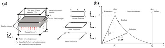 As illustrated in Figure 15a, the electro-thermal coupling experiment demonstrates that current conduction between adjacent fibers results in Joule heating. This thermal energy propagates through the fiber–resin interface, leading to the expansion of the resin. During the cooling phase, residual thermal stresses, which accumulate as the resin undergoes recuring (Figure 15b), exacerbate interfacial gaps and diminish bonding strength. Concurrently, the co-curing process under hot pressing conditions, involving a temperature reduction from 130 °C to ambient levels, induces residual stresses due to the disparity in thermal expansion coefficients between the composite material and the metal layer. These localized stress concentrations precipitate interfacial debonding.