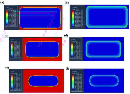 Figure 12b illustrates the initial condition at 20 °C, where the maximum stress is observed at the interface between the nichrome alloy and the polyimide. This stress arises due to the substantial disparity in their coefficients of thermal expansion (CTE), with the nichrome alloy exhibiting a CTE of 16 × 10−6/°C and the polyimide a CTE of 50 × 10−6/°C. Consequently, temperature fluctuations induce tensile stress at the interface. The stress levels in the peripheral areas surpass those in the central regions, with thermal residual strain predominantly influenced by thermal strain. Figure 13a demonstrates that after 10,000 heating cycles, cohesive unit damage is primarily concentrated at the upper interface of the nichrome alloy, adjacent to the upper polyimide layer. At this juncture, the interfacial stiffness decreases by approximately 20%, although no macroscopic debonding is observed. The amplitude of thermal residual stress increases by 10% compared to the initial cycles, attributed to stress redistribution resulting from damage. Figure 13c,e depict the stable propagation of thermal fatigue damage after 15,000 and 20,000 cycles, respectively. The interfacial area of failed units expands (D ≈ 0.6–0.8), with localized stress concentrations emerging in peripheral regions. The interface between the nichrome alloy and polyimide serves as the zone of stress concentration. Failure propagates radially from the periphery toward the central region. The peak interfacial stress at the metal–composite interface reached 73 MPa, surpassing the yield strength of the epoxy resin (65 MPa), resulting in interface delamination. Thermal fatigue cycling accelerated the progressive failure of cohesive elements, with the interfacial debonding area reaching 60% after 20,000 cycles, significantly compromising the interlaminar mechanical properties of the laminate.