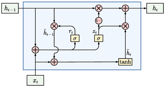At each time step, t, the GRU network first calculates two gate vectors, and , based on the input vector and the previous hidden state vector, , representing the reset gate and the update gate, respectively. Both gate vectors are computed via a sigmoid function, yielding values between 0 and 1 and representing each gate’s degree of activation or deactivation.