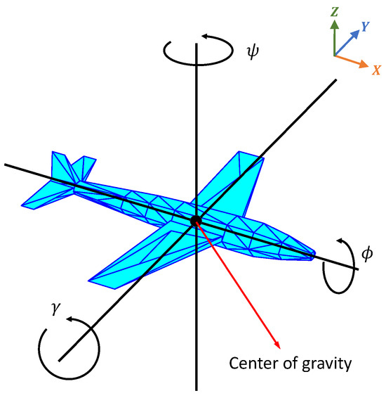In order to provide a thorough depiction of the aircraft’s status, the present study utilizes the terrestrial coordinate system as the fiducial framework. The aircraft’s state is characterized by three-dimensional coordinates (x, y, and z), velocity (v), and the angles of pitch, yaw, and roll (, , ), as illustrated in Figure 3.
