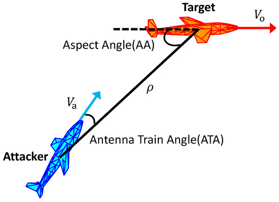 To exemplify, Figure 4 depicts the positional relationship between two aircraft engaged in an offensive maneuver. The aspect angle () and antenna train angle () emerge as pivotal parameters in assessing the engagement’s outcome. The methodologies for computing these angles are delineated below.