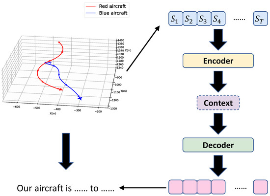 This study aims to describe and interpret the decision-making behavior of current AI algorithms using natural language. Specifically, the objective is to generate a complete natural language sentence based on a sequence of confrontation data over a period of time. The confrontation sequence used in this study consists of flight data over T consecutive time steps, with each time step represented by an N-dimensional feature vector encompassing various state information of both red and blue aircraft, as outlined in Equation (11). As both the input and output of this task are sequences, it can be regarded as a typical Seq2Seq problem, with a structure similar to that of machine translation.
