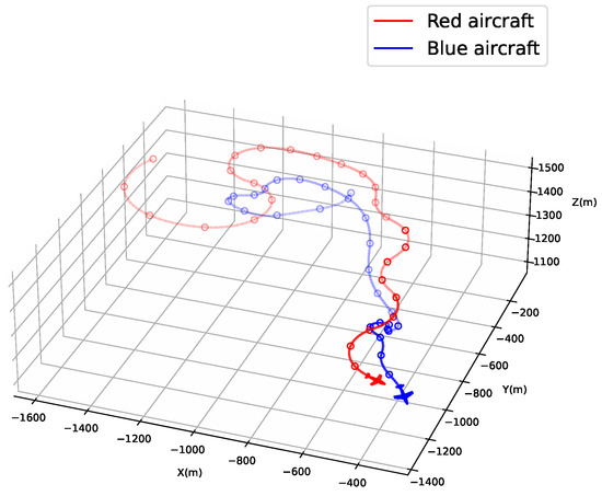 Extracted 5 s sequence data from the entire engagement. The red curve represents the red aircraft, and the blue curve represents the blue aircraft.
