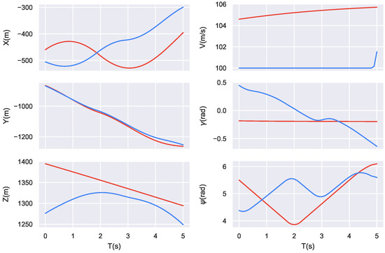 Figure 7 illustrates a 5 s sequence extracted from the example shown in Figure 6, where features such as position, velocity, and attitude angles are represented as time-varying curves. These data capture the dynamic states of both aircraft within the 5 s interval, forming the initial input format. After preprocessing, they are used as input to the encoder.