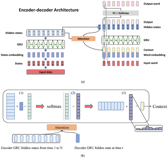 Structure of the model. (a) Schematic of the encoder–decoder architecture. (b) Computation flow of the attention mechanism.