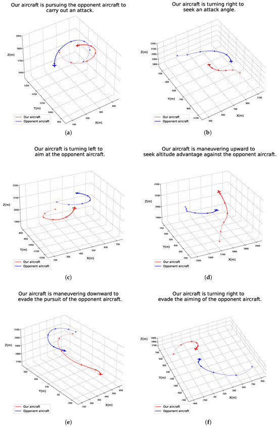 With Figure 9a taken as an example, at the current moment, our aircraft holds a relative advantage. It is positioned at the enemy aircraft’s side-rear, thus possessing a positional advantage, and it has been pursuing the enemy continuously for the past five seconds. By seizing the right timing to further adjust its angle, it can achieve successful targeting and engagement of the enemy. In Figure 9b, both sides are currently in a state of equilibrium, each seeking an opportunity to initiate an attack. At this stage, our aircraft is turning right to find an advantageous attack angle. Figure 9c depicts our aircraft swiftly transitioning from a balanced position within 5 s, successfully aligning its sights on the enemy. Figure 9d shows our aircraft performing a rapid upward maneuver to gain altitude advantage in the upcoming confrontation. In Figure 9e, after being pursued by the enemy aircraft for an extended period, our aircraft executes a swift downward maneuver to evade further pursuit. Finally, in Figure 9f, following the completion of turning maneuvers by both aircraft, a head-on engagement is imminent; at this point, our aircraft turns right to avoid the enemy’s targeting.