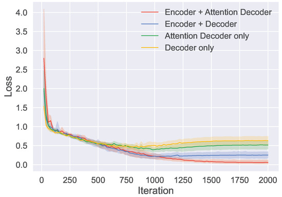 To objectively evaluate the performance of the proposed model, three different models were designed for comparison. These models consist of one employing both an encoder and a conventional decoder, one using only an attention-based decoder, and one using only a conventional decoder. For the two approaches that utilize only a decoder, the sequential data are directly input into the decoder. Each algorithm was trained five times using different random seeds. Figure 10 shows the loss curves for the different algorithms, and Table 1 presents the accuracy and BLEU4 scores for the various algorithms. The results show that, performance-wise, our proposed algorithm outperforms the other compared algorithms.