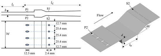 The computational domain for this study replicates the HIFiRE-2 experimental configuration, as shown in Figure 1. It includes an isolator, a combustor equipped with two opposing recessed cavity flameholders, and an exhaust nozzle. The isolator has a height h of 25 mm, a width w of 100 mm, and a length of 200 mm. The combustor extends over a length of 500 mm and begins with a short channel featuring body-side (top) and cowl-side (bottom) walls that diverge at an angle of 1.3 degrees, housing the primary injector arrays P1 and P2. This channel leads into cavities positioned on both the body and cowl sides, with cavity leading edges located 92 mm downstream from the combustor entrance. Each cavity has a depth d of 17 mm, a base length lb of 65 mm, and a compression ramp at 48 degrees. Following these compression ramps is another channel with body-side and cowl-side walls that also diverge at 1.3 degrees, and it contains the secondary injector arrays S1 and S2. The fuel, a binary mixture of ethylene and methane serving as a JP-7 substitute, has a methane fraction of 0.36. Fuel delivery is managed through four flush-mounted injector arrays—two primary (P1 and P2) and two secondary (S1 and S2), with injectors in each array spaced 25.4 mm apart. The outmost injectors are placed 12.7 mm from the spanwise walls. Primary injectors are mounted at a 15-degree angle relative to the body-side and cowl-side walls, while secondary injectors align perpendicularly to the combustor walls.