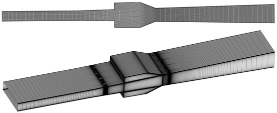 To access grid convergence within a feasible turnaround time, three levels of grid resolution were employed for a two-dimensional domain representing a spanwise-integrated flowfield. The mesh topology is shown in Figure 2. The coarsest mesh, termed Level 1, contains 4500 cells. Subsequent refinement, applying a refinement ratio of two in both dimensions, results in a Level 2 mesh consisting of 18,000 cells, while the finest mesh, Level 3, has 73,000 cells. Following the methodology of Roache [30], the Grid Convergence Index (GCI) method was utilized across the three meshes, with each successive grid (i and i + 1) refining such that grid i + 1 is finer than grid i. The GCI between two successive grids is defined as
