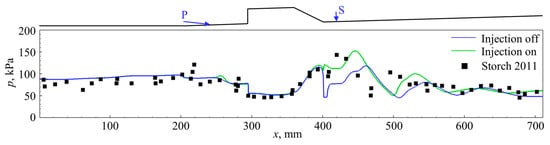 Wall pressure distributions along the top midplane (reacting flow) [16].
