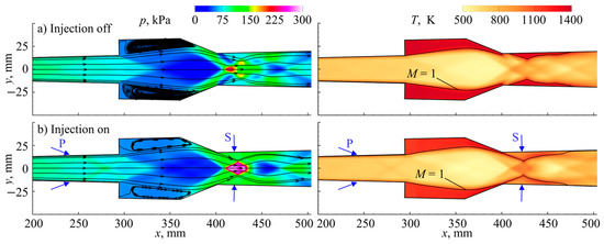 Figure 4 compares steady-state cold flows near the cavities with and without fuel injections. The pressure contours are overlaid with two-dimensional streamlines, and the temperature contours are overlaid with sonic lines on the spanwise midplane. In both scenarios, the flow expands upon entering the cavities, generating expansion waves near the front ramps and causing a notable decrease in pressure in the early part of the cavity region. Near-wall shear layers, marked by clustered streamlines and sonic lines, are lifted towards the cavities. Flow recirculation occurs within these cavities, creating a high local temperature conducive to ignition. Although the entrainment of primary fuel plumes, which are supplied at a total temperature of 300 K, slightly reduces the cavity temperature, it still reaches approximately 1300 K. In the later part of the cavity region, the flow converges, inducing recombination shock waves and an increase in wall pressure starting near x = 360 mm, as shown in Figure 3. At the end of the cavity rear ramps, the diverging geometry of the combustor walls leads to a pressure reduction near the walls, whereas intersecting shock waves create a high-pressure zone at the center of the flowpath. Specifically, in the scenario without fuel injection, the near-wall pressure reduction features distinct bands of low pressure at x = 406 mm. Conversely, in the scenario with fuel injection, the near-wall pressure reduction is disrupted by the secondary fuel injection, which triggers additional compression shock waves. These intersecting shock waves, stemming from the recompression of lifted shear layers on the cavity rear ramps and the secondary fuel injection, form a pronounced high-pressure region in the core flow. In both scenarios, the shock waves interact and reflect off the walls or near-wall shear layers as they travel towards the exhaust nozzle, forming a shock train downstream.