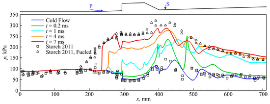 The reacting flow simulation initiates from the converged cold flow without fuel injection. As shown in Figure 4b, activating fuel injections leads to the formation of bow shocks ahead of the injectors, which are particularly prominent at the secondary injectors using normal injection angles. This effect reduces the pressure discrepancies previously noted between experimental and numerical (no fuel injection) non-reacting flowfields. As the fuel injection and fuel–air reaction progress, the flowfield changes progressively. Figure 5 shows the temporal evolution of the wall pressure distribution along the top edge of the spanwise midplane, where P and S denote the streamwise locations of the primary and secondary injectors, respectively. Shortly after the initiation of the reacting flow simulation (t = 0.2 ms), pressure increases are observed downstream of the cavities near the secondary injectors. The introduction of secondary fuel and the ensuing combustion create disturbances that, driven by backpressure, move upstream and elevate pressure within the cavities. By t = 1 ms, these disturbances reach the cavity entrances and propagate towards the primary injectors. Although the pressure profiles within the cavities are lower than those observed in the experiments, they display a similar trend, especially as the simulation proceeds. Near the primary injectors ahead of the cavities, bow shocks form and are coupled with increased backpressure, generating additional pressure disturbances. As the simulation continues, these disturbances propagate upstream towards the isolator through the subsonic regions of the boundary layers, further increasing the pressure to align with experimental measurements.