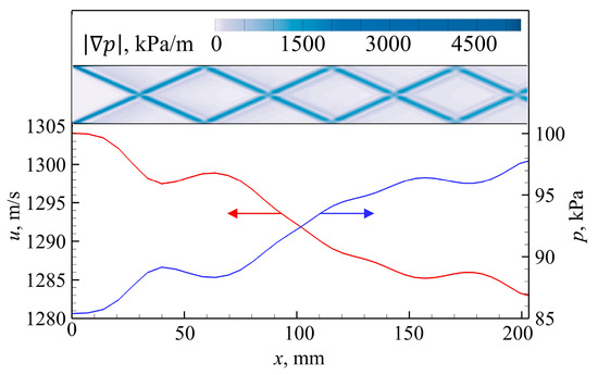 Isolator flowfield: (top panel) contour of the pressure gradient magnitude and (bottom panel) profiles of static pressure and axial velocity along the centerline.