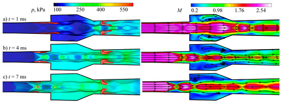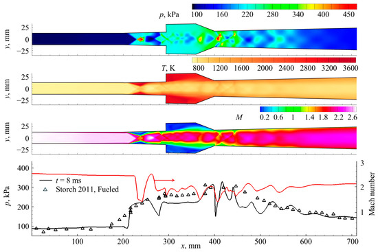 Contours of pressure, temperature, and Mach number on the midplane, and profiles of the wall pressure and centerline Mach number at t = 8 ms [16].