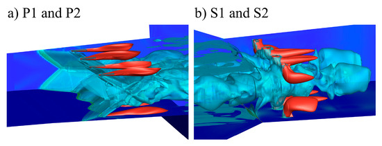 Flowfield near the primary and secondary fuel injectors at t = 4 ms: isosurfaces of kPa/m are colored in blue, and isosurfaces of are colored in red.