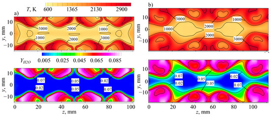 Distributions of temperature and combustion products at 4 ms aft of (a) the primary injectors, x = 270 mm, and (b) secondary injectors, x = 440 mm.