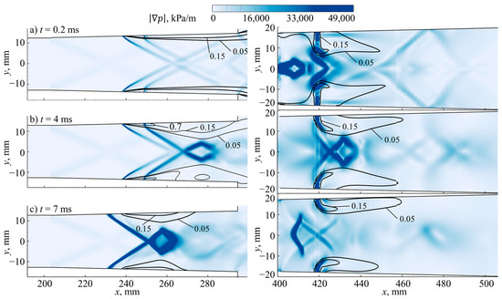Temporal evolution of pressure gradient magnitudes overlaid with isolines of on the plane of : (left panel) near the primary injectors, and (right panel) near the secondary injectors.