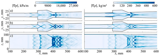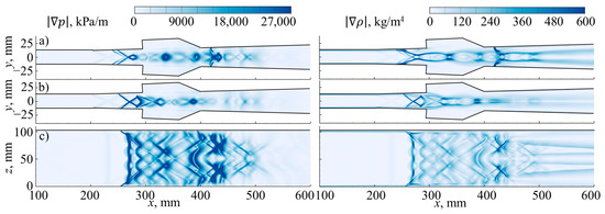 Distributions of pressure gradient and density gradient magnitudes at on the planes (a) , (b) , and (c) .