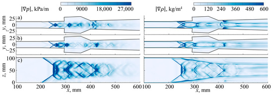Figure 12 shows the combustor flowfield at a further developed stage at t = 4 ms. The core flow has noticeably shrunk, as demonstrated by the density gradient magnitudes. Near the primary injectors, fuel plumes penetrate deeper into the core flow. Bow shocks stemming ahead of the injectors intersect these plumes even before entering the cavities at x = 280 mm, deflecting them towards the top and bottom walls. Upon entering the cavities, these plumes are pushed towards the core flow by the already established high-pressure inside the cavities (as shown in Figure 7b). The expansion waves reflect off these shear layers, generating compression at x = 320 mm and subsequent expansion at x = 340 mm, until strong recompression waves form around x = 380 mm due to geometric convergence. This wave–shear layer interaction significantly restricts the passage of core flow, and a similar phenomenon was observed in earlier research on confined supersonic flow with rectangular cavity regions [31]. With the axial intervals between wave–shear layer interactions shortening due to reduced core flow passage, coupled with disturbances propagating forward from the downstream secondary injectors, complex wave patterns emerge in the combustor region, extending from upstream of the cavities to the downstream nozzle. Compared to t = 1 ms (Figure 11), due to the reduced local axial flow speed, the secondary plumes at t = 4 ms are more likely to expand transversely and spanwise, promoting a more uniform flowfield in the downstream.