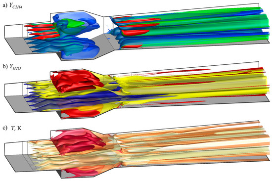 Understanding the flow and mixing characteristics within the two opposing cavities is crucial for assessing their flameholding capabilities. Figure 14a shows isosurfaces of the ethylene mass fraction () at several values at t = 4 ms, highlighting the injection, dispersion, and mixing of fuels from both primary and secondary injectors. At this instant, increased backpressure causes bow shocks to form upstream of the primary injectors, inducing near-wall flow separation. Consequently, the initially suppressed primary fuel plumes penetrate deeply into the core flow. Each plume exhibits a distinct concentration peak before entering the cavities, with the interaction between adjacent plumes limited to regions near the top and bottom walls. These isosurfaces closely resemble the shear layer profiles captured on the z/W = 3/8 plane in Figure 12. Although the elevated cavity pressure compresses the core flow within the shear layers, shock incidences deflect the plumes towards the cavities. This deflection enhances fuel entrainment into the cavities, as evidenced by the green and blue isosurfaces. Combined with cavity flow recirculation, a continuous fuel supply is established, supporting stable flames during steady scramjet operation.