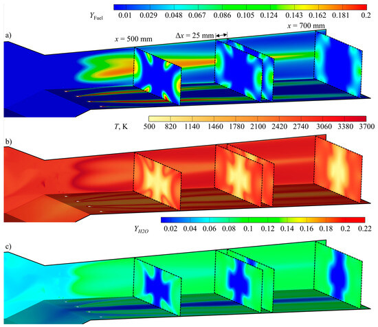 The current combustor demonstrates a strong capability for rapid mixing and combustion, as indicated by the observed fuel and product flowrates downstream of the cavity region in the exhaust nozzle. Figure 15 shows the distributions of fuel mass fraction (+), temperature, and water mass fraction () on the sidewall, bottom wall, and across several transverse planes at various axial locations at t = 8 ms. The aft-cavity region functions as an active reactive zone, as evidenced by the decreasing fuel mass fraction along the axial direction. Combustion products, except in a narrow zone near the flowpath centerline corresponding to the supersonic core, disperse both transversely and spanwise, occupying the majority of the nozzle cross-section. Over the 4 ms interval from t = 4 ms (Figure 14b) to 8 ms (Figure 15c), the previously isolated reaction zones in the expansion region downstream of the secondary injectors spread into the near-wall separated flow regions. By t = 8 ms, most of these regions exhibit ≥ 0.1, indicating sustained combustion. Elevated temperatures in the exhaust nozzle, driven by both chemical heat release and convective heat transfer, underscore the importance of thermal management in practical applications.
