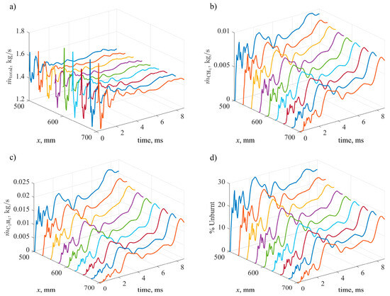 Mass flowrates are also integrated across regularly spaced transverse planes at various axial locations. These planes are spaced 12.5 mm apart, starting with the first plane at x = 500 mm, which is located 80 mm downstream of the secondary injector arrays to exclude contributions from the fuel plumes. The final plane is positioned at x = 700 mm, immediately upstream of the domain outlet. Figure 16 illustrates the temporospatial variations by comparing the temporal evolution of the results integrated over these planes. The total mass flowrate () encompasses species from fuel, air, and burnt products. Mass flowrates are also tracked for individual fuels: methane () and ethylene (), as well as the percentage of unburnt total fuel (%Unburnt). Shortly after the injectors are activated, a noticeable spike in occurs throughout the region at t = 0.16 ms. The spike reflects the flow adjustments upon injector activation. Fuel injection triggers the rapid formation of bow shocks and separation regions near the injector arrays, leading to fluctuating fuel mass flowrates from the injectors. The duration of these fluctuations provides insights into the time required to reach a post-injection local flow equilibrium. This spike quickly diminishes, settling into a slow cyclical variation by t = 1 ms, suggesting steady fuel injection and successful combustion initiation. Note that the total fuel mass flowrate entering the combustor is recorded separately, and its value remains constant at approximately 0.0618 kg/s, with negligible variation. The profiles of and exhibit similar trends, with approximately double the level of , reflecting the binary fuel mixture―64% ethylene and 36% methane―introduced into the combustor. During the combustor transient stage, although the remnant fuel mass flow rates at each location vary over time, they consistently decrease along the length of the aft cavity region, suggesting distributed combustion regions in the axial direction.