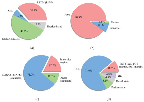 Figure 1d illustrates the target variables that were used in previous research: RUL, TGT (or EGT), health state, and engine performance. Due to the availability of the NASA C-MAPSS dataset, the majority of previous research focused on RUL prediction.
