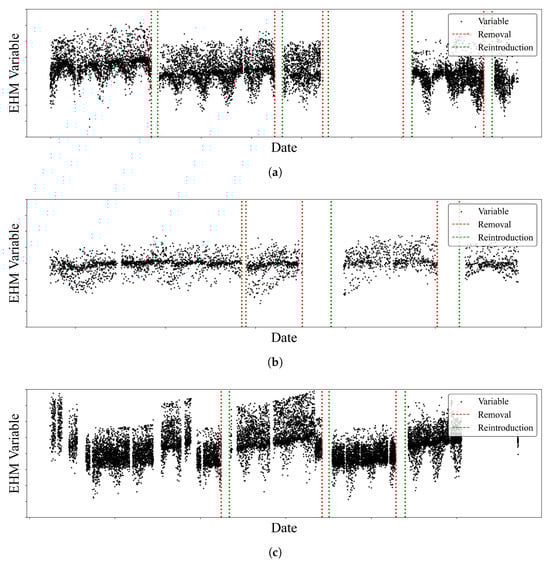 Figure 2 shows sampled EHM data of selected engines from each Trent family engine. The x-axis is Date, and y-axis is EHM variable. The black dots represent measured values of one EHM variable, whereas the vertical lines in red and green indicate the beginning (‘Removal’) and end of major overhauls (‘Reintroduction’), respectively. The data typically exhibits seasonal patterns with periodic fluctuations, as well as sudden changes following major overhauls. Additionally, it is important to note that there are unexplained gaps in the dataset due to missing data.