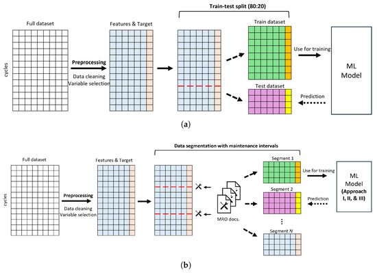 Conventional train–test split method and data segmentation using engine maintenance intervals: (a) Conventional train–test split, (b) Data segmentation using engine maintenance intervals.