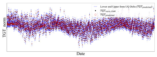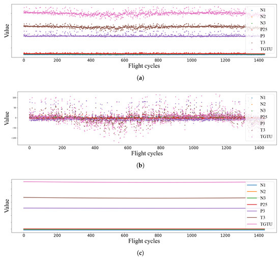 Figure 4 shows how detrending works on the given dataset. Examining the EHM data, some trends are apparent, such as long-term performance degradation and seasonality (Figure 4a). By removing these trends, the predictive model can focus on learning the underlying patterns in the residuals—specifically, the difference between the actual data and the trend (Figure 4b). Among various methods for detrending, polynomial fitting was adopted in this study. The polynomial function was fitted to the data, and its function values were subtracted from the original data during the preprocessing stage (Figure 4c).