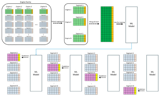 To achieve a compromise between model accuracy and processing demands, the model used more but not all of the data, incorporating only the first segment of each engine as a training dataset. For each turbofan family engine, all of the first segments were combined and fed into the model for training (Figure 5). The trained models were tested on the remaining segments of each family engine, the same as Approach I. It is worth noting that if the train–test method was applied, the amount of training data would be approximately two times larger.