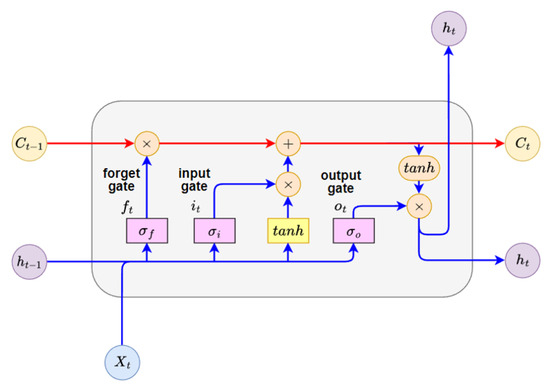 In general, standard RNNs contain a simple layer within their modules, which are connected sequentially in a chain-like structure. In contrast, LSTM consists of four neural network layers interacting in a specialized way (Figure 6). The cell state running from to is the key to LSTM (Equation (1e)). There are three gates regulating this cell state, which are composed of a sigmoid neural net () and a point-wise multiplication operation. The sigmoid layer outputs numbers between zero and one, controlling how much of each component should be let through. A value of one lets everything through, and zero lets nothing through.