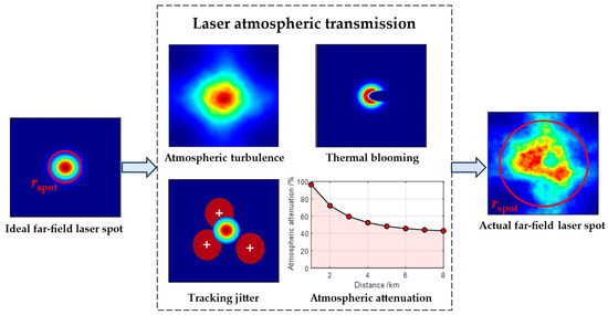 where L represents the transmission distance and β is the beam quality factor, which is used to characterize the beam quality degradation of the laser in the far field after being focused and transmitted through the atmosphere. Due to the existence of atmospheric turbulence effects, thermal blooming effects, and absorption and scattering effects, and when laser is transmitted in the atmosphere, as well as the jitter of the laser itself, each step in the transmission process deteriorates the beam quality, thereby reducing the laser irradiation capacity and causing an expansion of the spot area, as shown in Figure 2.