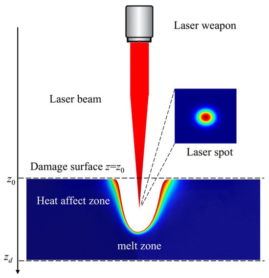 The damage mechanism of HELSs relies on the thermal effect of lasers. As the laser beam transmitted through the atmosphere and irradiates the target surface, photons are absorbed by the material’s electrons, converting light energy into heat through collisions. This process causes the temperature of the material to rise rapidly from the surface to the interior. When the temperature of a material reaches its melting point or boiling point, melting or even vaporization will occur. During this process, pits will form on the surface of the target, and, in severe cases, penetrations may even occur, thereby damaging the integrity of the target structure and ultimately achieving a destructive effect on the target [27]. Based on the damage mechanism of HELSs, the following are, respectively, constructed—the characteristic model of laser transmission through the atmosphere and the laser thermal damage model—thereby forming a quantitative description of the damage capability of HELSs.