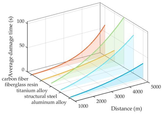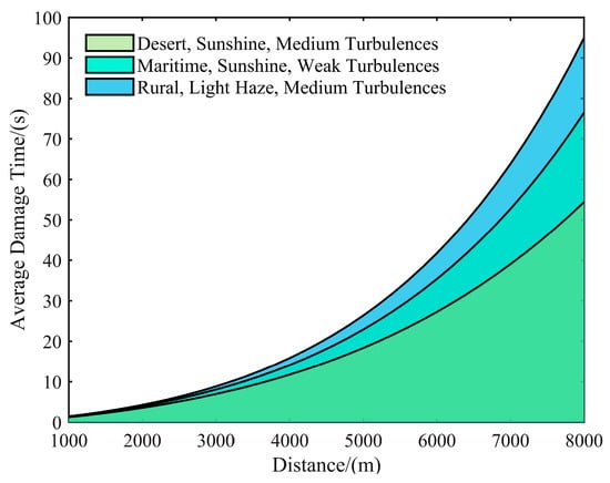 Based on the above discussion, taking the commonly used 2024 aluminum alloy material (5 mm) for UAVs as an example, the HELS damage capability under different turbulence intensities, different weather visibility, and different regional environments was modeled and simulated, and the relationship between the damage time and distance was obtained, as shown in Figure 5.