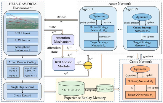 - To tackle the challenges of dynamically varying state dimensions, sparse extrinsic rewards, and limited resources when solving the HELS–UAV–DRTA problem via DRL, we proposed the MADDPG-IA (Multi-Agent Deep Deterministic Policy Gradient, MADDPG; I: intrinsic reward, and A: attention mechanism) algorithm. An attention-based encoder aggregates variable-length target states into fixed-size representations, while a Random Network Distillation (RND)-based intrinsic reward module provides dense exploration rewards, substantially boosting both performance and practicality.
