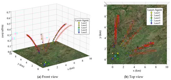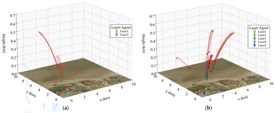 - The scale of the UAV swarm affects the damage decision. Under the same atmospheric environment, the decision-making timing of each HELS agent changes with the variation in the scale of the UAV swarm. Take Figure 13a,b as examples. In the small-scale scenario shown in Figure 13a, due to the smaller number of targets in the airspace, the HELS agent has more reaction time. Therefore, on the premise of ensuring safety, the HELS agent will delay the damage decision, choose to irradiate the target at a closer distance, and exchange a shorter irradiation time for damage for a higher damage benefit. In Figure 13b, as the number of targets increases, the agent cannot bear the risk of the strategy of delaying decision-making to wait for the optimal timing. Therefore, it will make decisions as early as possible to damage as many targets as possible. In the above-mentioned desert environment, the distance for the first irradiation of the target in the small-scale scene was 3.79 km, and that in the large-scale scene was 7.18 km.