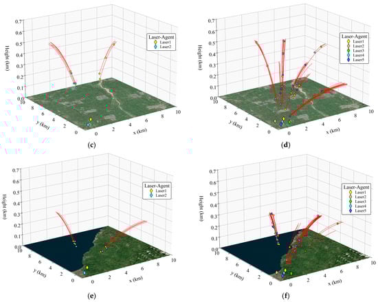- The atmospheric environment affects the damage decision. When the atmospheric environment is favorable, the damage ability of HELSs is strong, and the HELS agent has more flexible decision-making strategies and can obtain more decision-making opportunities by intercepting at a closer distance. In the small-scale scenarios (Figure 13a,c,e), the distances of the first target interception were 3.79 km (desert), 6.69 km (rural), and 4.21 km (coastal), respectively. In addition, when there is a significant difference in the atmospheric environment between HELSs and UAVs, the atmospheric undulations will be obvious, resulting in a considerable difference in damage capabilities. For instance, in the coastal atmospheric environment, the HELS agent will prioritize irradiating targets on the sea surface that are easy to intercept, to achieve a higher damage efficiency. In large-scale scenarios (Figure 13b,d,f) and Table 2, the mean damage rates under the influence of the three types of atmospheric environments are 99.65% ± 0.32%, 79.37% ± 2.15%, and 91.25% ± 1.78%, respectively (100 runs per scenario), indicating that the HELS–UAV–DRTA model can significantly adapt to the influence of the atmospheric environment on decision-making. The results represent mean damage rates from 100 independent trials per scenario. The traditional ‘detect and intercept’ strategy was evaluated under identical conditions for a fair comparison. Compared with the average interception rates of 72.64% ± 3.21%, 51.29% ± 4.87%, and 67.38% ± 3.95% of the traditional strategy in large-scale scenarios (100 runs per scenario), it significantly improves the interception efficiency of multi-HELSs against UAV swarms. In addition, the performance of HELSs, and the distribution pattern and maneuverability of UAVs also have an impact on damage decision-making, which will not be discussed here.