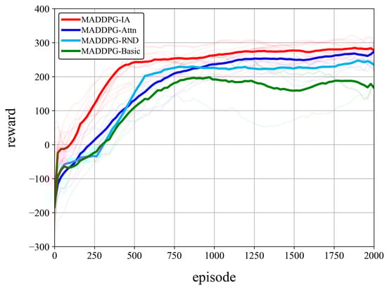 An ablation experiment was constructed to analyze the improvement value of the MADDPG-IA algorithm. The proposed MADDPG-IA algorithm, the MADDPG-RND algorithm improved by the RND-based intrinsic reward module, the MADDPG-Attn algorithm improved by the attention mechanism, and the MADDPG-Basic algorithm are used for the ablation experiment comparison. The experimental scene is the large-scale scene of five Laser-50 UAVs constructed in Section 4.2.1, and the atmospheric environment and other parameters are the typical default settings. Figure 15 illustrates the comparison results.