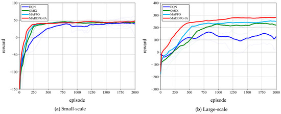To further illustrate the performance of the MADDPG-IA algorithm, this section takes the large-scale scene constructed in Section 4.2.1 as an example and conducts 100 training sessions for 2000 rounds. The corresponding curves of the reward values of each agent and the global revenue are shown in Figure 14.