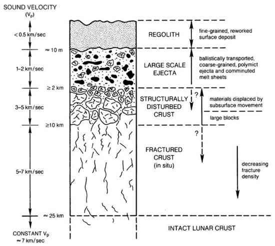 The lunar subsurface exhibits distinct layering characterized by varying seismic velocities that reflect its geological evolution [36,49]. Figure 1 illustrates the vertical structure of the lunar crust, showing the relationship between depth, P-wave velocity, and geological characteristics [49]. The uppermost surface layer consists of regolith extending to approximately 10 m depth, characterized by very low seismic velocities less than 0.5 km/s, representing the highly processed and reworked surface deposits. Below this lies a layer of large-scale ejecta with seismic velocities of 1–2 km/s, composed of ballistically transported, coarse-grained polymict materials and comminuted impact melt sheets [49]. This transitions into a structurally disturbed crust zone exhibiting velocities of 2–3.5 km/s, where materials have been displaced by subsurface movement and contain large blocks. Further down, a fractured crust region extends to about 25 km depth, showing increasing seismic velocities from 5 to 7 km/s and decreasing fracture density with depth [50]. Finally, at depths beyond 25 km, the intact lunar crust maintains a relatively constant seismic velocity of approximately 7 km/s, indicating minimal fracturing and more uniform material properties.