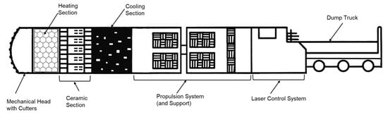 Schematic diagram of the Lunar Tunneler concept showing the major subsystems, including the cutting head, nuclear power system, and glass-forming sections for tunnel wall stabilization [51].