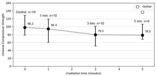 Comparison of uniaxial compressive strength of basalt according to microwave irradiation time. Error bars represent standard deviation. Sample sizes (n) are indicated above each bar.