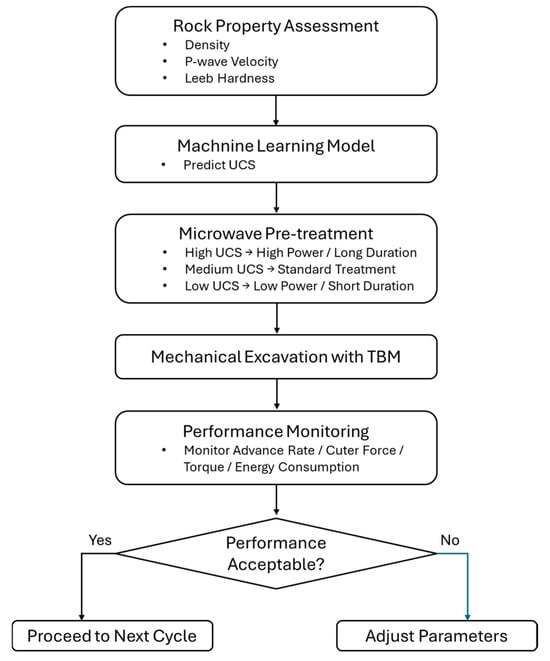 To illustrate the operational concept of the integrated microwave-assisted TBM system, Figure 5 presents a comprehensive flowchart showing the complete process from initial rock assessment through adaptive control. This systematic approach ensures optimal performance by continuously adjusting operational parameters based on real-time feedback. The flowchart demonstrates the adaptive nature of the system, where microwave treatment parameters are automatically adjusted based on predicted rock strength. This feedback mechanism ensures optimal energy utilization while maintaining excavation efficiency across varying geological conditions.