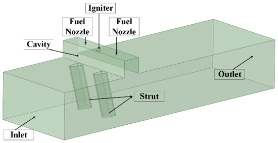 This study employs a simplified model of a certain type of afterburner combustion chamber; the simplified afterburner model is shown in Figure 1. The mainstream direction of the afterburner is from left to right. The model has a cavity and a strut flame stabilizer. An igniter and two pilot fuel nozzles are installed on the upper side of the cavity. The igniter is located in the middle of the cavity near the direction of incoming flow. The fuel nozzles are located in the middle of the igniter and the two side walls. The igniter and the fuel nozzle are used to form the pilot flame in the cavity, and the strut flame stabilizer is used to transmit the flame and ignite the mainstream fuel to form a stable combustion area.
