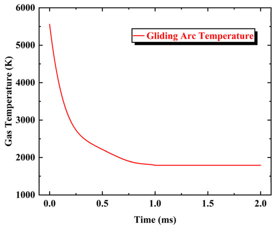 The gliding arc breakdown discharge process comprises three distinct phases: breakdown, evolution, and rupture. In this study, the gliding arc can be characterized as a repetitive excitation thermal jet enriched with reactive species. The operational parameters of the gliding arc were determined through integrated experimental measurements and numerical simulations, where the velocity of the thermal jet is selected from the average velocity of the gliding arc plasma jet igniter outlet of 30 m/s. The temperature of the thermal jet varies as a function of time. The outlet temperature of a single excitation is shown in Figure 2. When the excitation power supply remains energized, the gliding arc maintains a dynamic thermal equilibrium (around 1800 K) from 1 ms until the next re-ignition. During this period, the heat production, which is dominated by chemical reactions and electron elastic collisions, is approximately balanced by its heat losses. After the generated species stabilizes, the plasma jet outlet components containing the oxygen element (as active radicals) include O2, O, O(1D), O+, and other components. Since the content of O2 and O is much higher than that of other components, other components can be ignored in the actual simulation. Finally, the species fractions are as follows: O2 is 12.96%, O is 9.87%, and N2 is 77.2% [30].